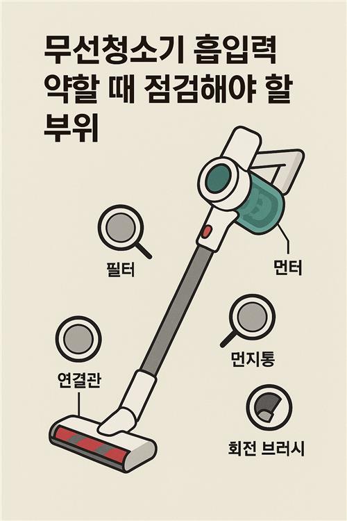 무선청소기, 청소기 점검, 흡입력 회복, 필터 청소, 브러시 관리, 배터리 점검, 청소기 수리, 모터 이상, 가전제품 관리, 집안일 꿀팁
