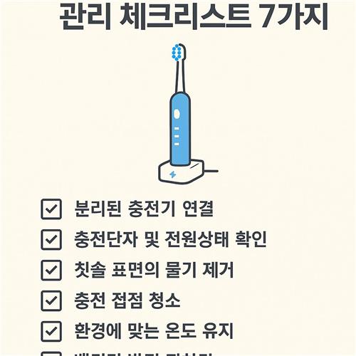 전동칫솔도 올바른 관리가 필요합니다. 정기적인 점검과 청결 관리만 잘해도 충전 오류나 기능 고장을 미리 예방할 수 있어요. 아래 체크리스트 7가지를 주기적으로 실천해 보세요!